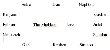 Hashem instructs Moshe and Aharon to arrange the 12 tribes of Yisrael (Israel) around the Mishkan. The tribe of Levi was to be the group to carry the Mishkan and all the things contained inside it. No one else was allowed to put up, or take down, or carry the Mishkan. At night, each tribe was given a place to set up camp around the Mishkan to protect it. And during the day, they walked in the same formation. Moshe thought the people would argue about who would go first, but each tribe had their own special place, and their own special jobs. They all worked together to protect the Mishkan. The order around the Mishkan went like this: